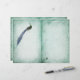 An aged effect green patterned background with proud peacock and pale white details. Perfect for capturing your memories, thoughts and aspirations. This design has faint ruled lines ideal for creating your own spring journal pages. Paper features the same design on front and back so all you need do is fold in half.