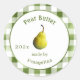 This charming vintage style food label for homemade pear butter features a green and white buffalo plaid style border and a pear in the centre. Easily customise the year and name using the drop down menu. Perfect for the hobbyist home canner and homesteader or a small cottage kitchen business. They also make great labels for gifts of homemade pear butter.