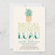 Aloha! Throwing a luau themed bridal shower? Invite friends and family with our cute bridal shower luau invitations, featuring a vintage style pineapple illustration in green and gold with "bridal shower luau" in pear and emerald green typography.