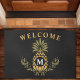 Vintage Pineapple Monogrammed Personalised Doormat. This elegant design features a beautiful vintage style pineapple in muted tones on a black background. Personalise this custom design with your own welcome greeting and family monogram initial.