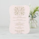 Elegant and formal wedding dinner menu cards feature decorative swirls and flourishes that frame the vintage inspired design. Pale pastel pink and antique gold colours. Personalise with the bride and groom names, event date, and menu details.