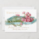Romantic bouquet of vintage pink carnations and ribbon in a pastel teal box with faux gold Valentine greeting. Complementary floral graphic and editable text fields on back.
