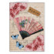 A vintage, pink die cut of a fan, with a spray of blue flowers and french text, is on pretty typographry background. The upper left and bottom right corners each have three pink roses. Two blue butterflies with white spots are in the bottom left corner. A vintage tag has the word "Paris" on it.
