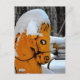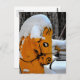 This vintage orange rocking horse playground toy is wide-eyed and sporting a mound of snow on his head. The orange makes a stark contrast with the black and white landscape of the season.