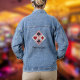 Denim jacket with a heart, spades, diamonds and clover of the famous Colours of playing cards in a vintage style and customisable text. Perfect gift to a girl who is a lover of cards games!