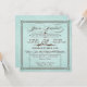 This beautiful, pale seafoam blue square wedding reception invitation, with chocolate brown text has a vintage, old fashioned feel with old-timey letter design, including elaborate script elements, a decorative banner, stars and a swirly ampersand. The fancy invitation is inspired by both vintage design and stylish posters. The text reads: "You're Invited to the wedding reception of [customisable name] & [customisable name] [customisable date] [customisable time]. Please Join Us for an Unforgettable Celebration". Further personalise the invitation with the reception information and address, in the box with dotted border.