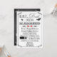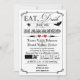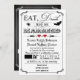 This vintage poster style "Eat, Drink and be Married" post-wedding Halloween reception typography black and white chalkboard LOOK wedding invitation has a variety of scary looking fonts and scrolls on it, along with a pair of red hearts, a spider on a spider web, a black bat, and pointing hands. It has the funny take on the "Eat, Drink and Be Married" trend that is perfect for the young hipster couple, the gothic couple, or the chic couple wanting a truly original Halloween wedding invitation that will be remembered by all their guests. It is shown here on basic paper. It is easily customised with your own information. There is some customisable text that you can edit the way you require. ALSO, please note that everything will print as it appears on your monitor. Zazzle will not edit anything for typos or alignment etc., and I will not see it once you have ordered it. If you need help with your wording, please email me BEFORE you order. If there are any other items you need to make your event extra special, please email your request to niteowlstudio@gmail.com.