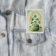 Button with a seasonal St. Patrick's Day image. Faded grunge style paper. A green pot of gold with coins