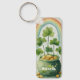 A keychain with a seasonal St. Patrick's Day image. Faded grunge style paper. A green pot of gold with coins