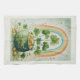 A kitchen towel with a seasonal St. Patrick's Day image. Faded grunge style paper. A green pot of gold with coins