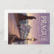This postcard features a beautiful vintage-style illustration of Prague, Czech Republic, specifically showcasing the iconic Charles Bridge at sunset or dusk. The bridge's cobblestones and statues are illuminated by warm streetlights, with the city's charming skyline visible in the background under a soft, pastel-coloured sky. The word "PRAGUE" is written vertically on the right side, framed by decorative swirls.