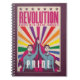 Vintage style propaganda spiral notebook featuring two men wearing blue shirts holding a pink flag. Behind them is a rainbow sunburst design. The phrase "revolution starts with loving yourself" is at the top of the front cover underneath a line of stars. The word PRIDE is highlighted at the bottom in white bold text.