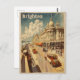 Transport yourself to the charm of yesteryear with our vintage travel ad design capturing the timeless allure of Brighton's sunny coastal promenade. Stroll along the boardwalk surrounded by historic architecture as the sun bathes the seaside in golden hues. This postcard invites you to experience the elegance of a bygone era amidst the lively coastal atmosphere of Brighton.