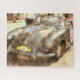 The image on this Jigsaw Puzzle is an original photograph of a rally car arriving at the finish line in Biarritz, France. The rally began in Paris, three days earlier. The dark green sports car is perhaps fifty years old. We see the front of the convertible with its chrome trimmed headlights, orange blinker and yellow, red and white rally numbers.