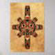 This Haida inspired sun design features a stylised mask at the centre of the star. Eight stylised rays reach out from the middle of the sun creating symmetrical pattern. Two hands fall just beneath the tooth filled mouth which gives this native pattern an aggressive and stylish look. Rough textures and natural colours gives the pattern a vintage, worn look. This stylish sun design is a striking graphic inspired by the art of the Haida.