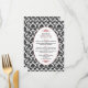 The design features a vintage black and white damask background with a decorative red border frame with an ornate floral flourish and is finished with elegant wording in black and red.