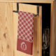 Vintage red and soft beige botanical monogram frame, plaid kitchen towel.