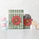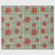 A repeating pattern of red blooming flowers with green leaves placed over a classic green and cream plaid grid.