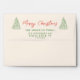 a vintage retro minimalist simple red and green Merry Christmas trees holiday envelope. As you see it features a plain creamy colour background with green handwritten script typography of Return address info. And you got red merry Christmas calligraphy . Along with the your customisable return address. And hand drawn green Christmas trees made of ribbon bows.