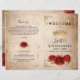 Create your own beautiful red and gold quinceanera programs on a parchment paper DIY template that is easy to personalise. The vintage floral design by Raphaela Wilson features burgundy red roses accented in a pretty faux metallic gold, a royal princess crown/tiara, sparkle glitter butterfly confetti and luxurious filigree borders. The black typography combines chic calligraphy script and modern fonts, but feel free to alter this style to your liking. The old scroll parchment sheet of paper can be folded, and serve as elegant watercolor wedding programs with a red and gold theme, or for a rustic ranchera Mexican sweet 15 / 16 birthday party (as well as other special occasions since all text can be worded to suit your event). Be sure to add personalised details, including names, location, date, mass ceremony / order of service, your honoured party of chambelanes / damas, and a custom thank you message. If you would like to keep your text to a minimum, you can also add a Mis Quince Anos photo instead to one of the panels. Your red and gold quince program can be cherished as a keepsake long after your big day has passed. Category: folded quinceañera program schedule/template; royal fairytale wedding program with butterflies; and elegant wedding programs and ideas. Gold and red quince theme colours: dark red, burgundy, maroon, marsala, light brown, tan, yellow champagne gold, and black.