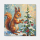 A whimsical vintage Christmas scene featuring a red squirrel decorating a tiny pine tree with winter berries. A sweet and nostalgic woodland moment perfect for holiday products.