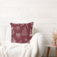 A seamless vintage Christmas toile pattern throw pillow featuring classic holiday motifs intricately illustrated white line art on a red background. The design includes Christmas stockings filled with gifts, wrapped presents with ribbons, holly branches with berries, snowmen, Christmas trees, and candy canes, all rendered in fine, hand-drawn detail. This nostalgic and elegant pattern evokes the charm of old-fashioned Christmases.
