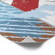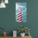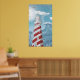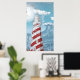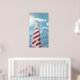 Vintage red white striped lighthouse and blue waves grunge poster print. An architecture structure with red white stripes.