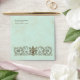 This elegant and sophisticated invitation envelope blends the best of tradition and the freshness of the contemporary. Mixing Vintage art elements and contemporary watercolor art work hand painted by Audrey Jeanne Roberts gives a beautiful and timeless quality to this invitation. Two Love birds guarding a beautiful blue egg amidst a elegant swirls, a crown and an antique etching frame. Robin's Egg Blue Colour Version, also available in cream & tan. YOU MIGHT ALSO ENJOY: WEDDING INVITATIONS: