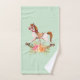 A towel set with a charming and fanciful image of an old fashioned rocking horse with a pretty floral bouquet in pink and yellow. Celery green background.