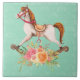 Ceramic tile with a charming and fanciful image of an old fashioned rocking horse with a pretty floral bouquet in pink and yellow. The background is a light green shabby damask pattern.