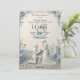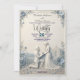 Announce your timeless love story with an elegant, traditional aesthetic featuring a beautiful dusty blue and cream palette for your formal celebration.This design showcases a classical romantic aesthetic centred on a beautifully illustrated proposing couple motif. The visual hierarchy draws the eye from the delicate floral corner borders—composed of roses, daisies, and botanical leaves—down to a man kneeling with a ring before a woman in an elegant gown. The backdrop depicts a classical chapel and cobblestone path set against rolling hills, all rendered in a cream and off-white base with dusty blue accents. The layout balances formal navy blue calligraphy script with clean modern sans-serif numbers and classic serif lettering.This is a flat printed image with a faux 3D bas-relief style and embossed effect, not actual raised material.