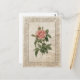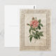 Retro postcard featuring a vintage botanical illustration of a pink rose with antique French style embellished frame and crumpled old paper texture.