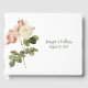 Pretty wedding guest book done in a off white on white bold horizontal stripe pattern, with lovely vintage artwork of pale pink and white roses. Personalise the text fields for your special day. Matching wedding products are available.