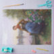 On The River's Edge by painter Daniel Ridgway Knight depicts a vintage french woman with a red scarf sitting on a rock wall next to a boat on the lake with flowers in the foreground.