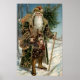A beautiful vintage poster featuring Santa Claus walking through the snow.