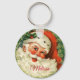 A key chain with a retro image featuring a smiling happy Santa Claus surrounded by a pine wreath with a sprig of holly in his cap.