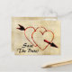 Romantic old fashioned vintage style look "Save The Date" postcards with two red hearts and arrow. Formal text can easily be changed and personalised. Great for an upcoming Valentine's Day party, weddings, engagement, anniversary parties, etc. Back can also be personalised with more text or left blank to hand write later as needed. See matching postage stamps at the MVDesigns store here at Zazzle.