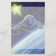 Vintage illustration futuristic science fiction planets in outer space image. A classic comic book design featuring a retro sci fi astronaut on a spacewalk and floating in outer space over the earth with a bright moon or sun behind him in the night sky with stars.
