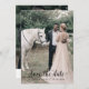 This vintage script light photo template save the date card is perfect for a minimalist wedding. The romantic black and white design features unique whimsical typography with simple bohemian style. Customisable in any colour. Keep the design minimal and elegant, as is, or personalise it by adding your own graphics and artwork.