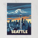 A vintage-style travel poster depicts the Seattle skyline dominated by the Space Needle, set against the majestic, snow-capped Mount Rainier under a dramatic sky with hues of blue, orange, and grey. "SEATTLE" is prominently displayed at the bottom.