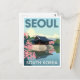 Share the tranquil beauty of Seoul, South Korea, with this beautiful vintage travel poster style postcard. The design features a traditional Korean palace pavilion, likely the Hyangwonjeong Pavilion at Gyeongbokgung Palace, reflected perfectly in its pond. The scene is framed by vibrant pink cherry blossoms and lush greenery, evoking the charm of spring. This postcard is perfect for sending greetings, celebrating Korean culture, decorating with soft colors, or collecting retro Asian travel art. A peaceful and elegant piece for travel lovers.