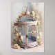 An exquisite, ornate antique birdcage in soft, muted pastel hues of pale peach, dusty rose, and misty blue, adorned with delicate, curved ironwork and subtle, patina-like imperfections, is elegantly draped with gentle, hand-painted vines and an assortment of blooming flowers in shades of ivory, blush, and powder pink. The whimsical watercolor style evokes a nostalgic, charming atmosphere, with the intricately detailed cage featuring tiny, ornate locks, delicate bars, and a delicate, curved door that appears to be slightly ajar. The dreamy background blends into subtle, faded pastels, evoking a warm, vintage feel, with hints of creamy whites, beiges, and mauves that subtly gradate into a soft, ethereal mist.