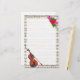 Vintage classical sheet music is the background for this musical design with a violin in one corner and a bouquet of roses in the opposite corner. The centre is faded for easier writing, and the sheet music forms a frame along the outside of the paper.