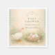 A charming storybook-style baby shower design featuring a sweet watercolor goose standing beside a nest filled with pastel eggs. Delicate spring flowers and soft greenery create a gentle countryside scene, while a blush bow and sage gingham background add a cosy cottagecore touch. The vintage illustration style and soft pastel palette give this design a whimsical nursery feel, perfect for a playful and heartwarming baby celebration.