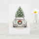 A beautifully nostalgic Christmas card featuring a classic silver car carrying a freshly cut Christmas tree on its roof. A festive wreath with a bright red bow decorates the back, adding a warm traditional holiday touch. Soft vintage tones, gentle snowfall accents and hand painted details create the charm of an old fashioned Christmas journey. A lovely way to share heartfelt Merry Christmas wishes.
