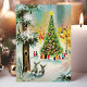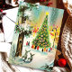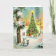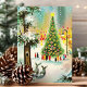 Vintage Snow Bunnies Christmas Tree Scene Holiday Card. This design features bunnies in the snow in front of a lit Christmas Tree. What a beautiful retro holiday scene. Personalise this custom design with your own inside greeting.