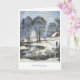 The image on this greeting card is a vintage winter scene with snow, trees and a barn. It says "Think spring...but have a HAPPY BIRTHDAY." The card can be personalised.