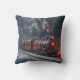 Old-fashioned steam locomotive in a snowstorm with glowing red lights.