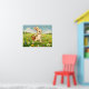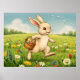 Celebrate Easter holiday with this charming super adorable Greeting Card featuring a joyful white bunny hops through a sun-drenched meadow bursting with wildflowers — daisies, tulips, bluebells, and dandelions — while carrying a woven basket filled with colorful, patterned Easter eggs.