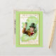 Charming old world illustration featuring St. Patrick's Day Greetings in gold script with Emerald Isle poem, map of Ireland and young man holding a bunch of clover.